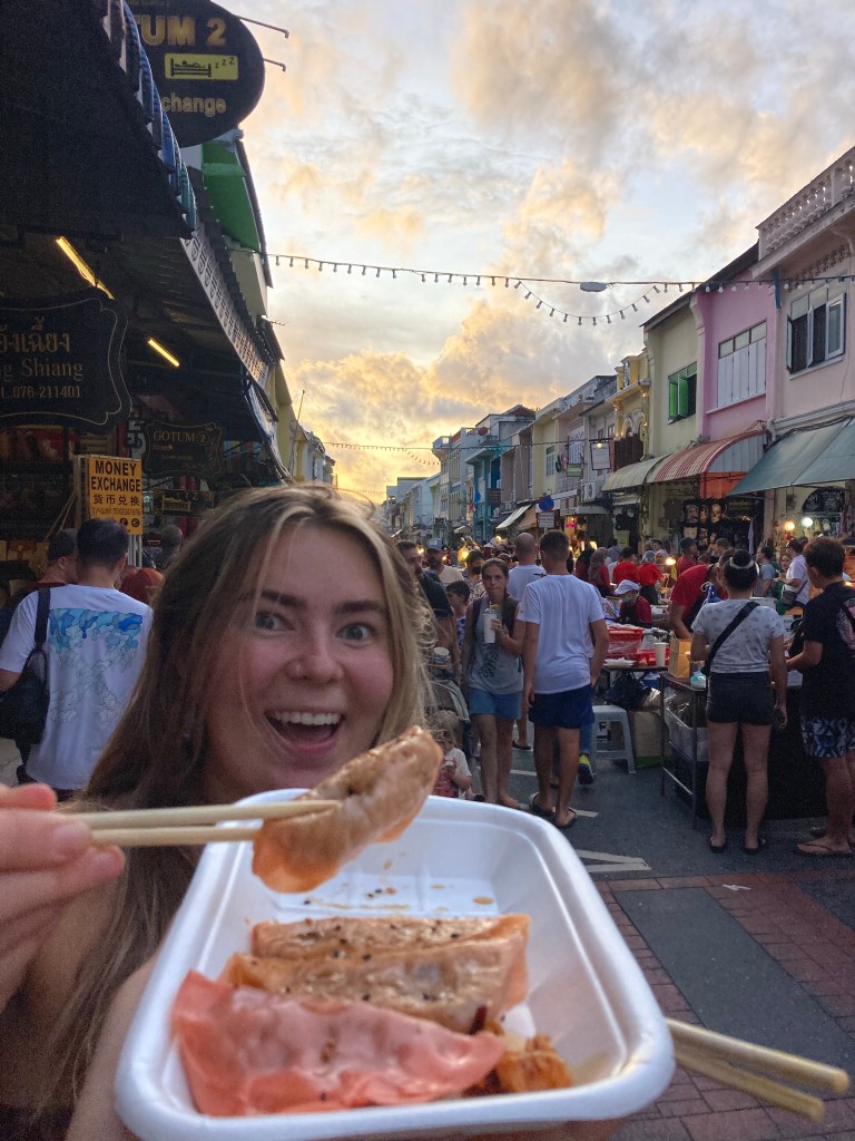 The Phuket Weekend night market, which was the market we had been seeking, takes place on the famous Thalang road, offering street food, second hand clothes, handmade goods, and just about anything else you can imagine! We strolled down the street browsing the stalls, listening to the performers, and taking in all we could. We treated ourselves to the BEST dumplings I have ever tried, and I picked up my very own sarong to replace my mums sarong from 1994, which is sadly now torn from wear. Though I would like to say I practiced my haggling, Dara definitely took centre stage in that front, making the vendors laugh as he negotiated, throwing in his (not very) extensive Thai. Thalang road was beautiful to witness and embrace, and though slightly on the chaotic side, a tame experience compared to the sensory overload the vegetarian festival had treated us to.