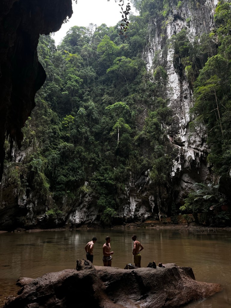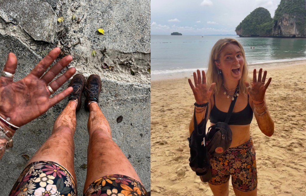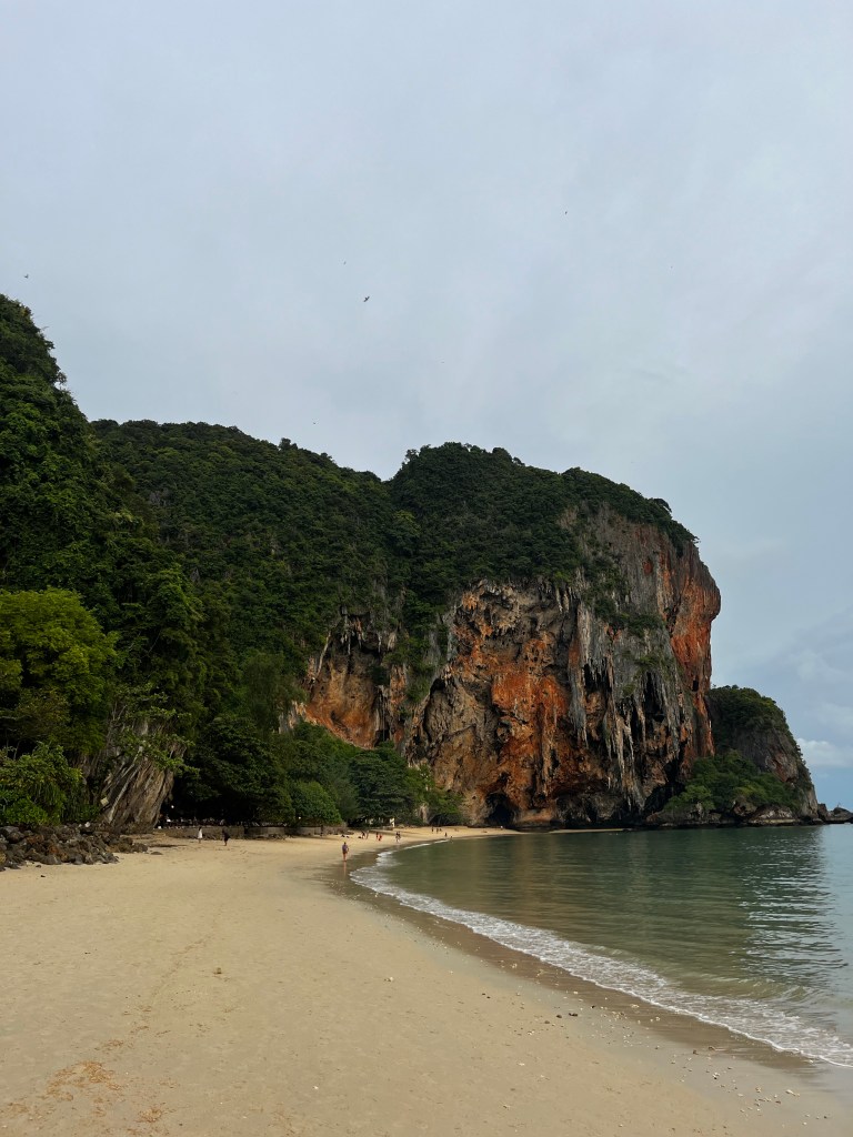 Ralph had done his research and we set off towards a famous lagoon located on the headland. En route we passed Railays most popular rock climbing spot, stopping to admire the bodies scaling the high rocks, noting to myself my fear of heights would definitely prevent me from attempting such a feat! Seeing the first small wooden sign with ‘lagoon and viewpoint’ written, we looked up the steep rockface leading into the jungle ahead and thought- why not. Using ropes which were tied between trees we started to navigate our way up, slowly and sweatyly making progress. Though I had reservations at the thought of scaling steep rock in the middle of an unknown jungle, I quickly embraced the adventure, and was for sure rewarded for it. Reaching the top, we veered left and found the viewpoint, gazing over Railay beach and onto the horizon as blue skies teased their presence behind the clouds. With promises of lagoons in our minds, we continued through the growth and were faced with a steep descent, angling our way down around tree roots and rock, and even through a cave opening- which I very nearly slipped off but I managed to continue my way down. Slightly tense and more than slightly sweating, we glimpsed water ahead. Though not the lagoon we had seen photos of or expected, a beautiful scene spread out before us, grey water reflecting the sky above as it peeped through the scaling cliffs around. By this stage, we were all absolutely covered in red clay mud, caked from our shoes all the way up to our sweaty faces. Trying our best to clean ourselves up, we redressed into our muddy clothes and headed for home before the sun sank and we were left in the jungle (although, I was thinking to myself that being stuck four of us in this bliss wouldn’t be too bad!). The way home was just as steep and just as slippy, and the lagoon bath was really not necessary- as two minutes into the journey we were once again red, head to toe.