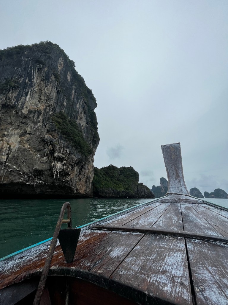 The boat trip to Railay itself is simply stunning, the jagged rock formations and dramatic cliffs jutting gracefully into the sea. Jumping off the longboat into shallow waters, I knew we were in for a treat. Railay beach itself is beautiful, and the misty rain gave us a unique chance to see it without the usual tourist crowds hunting down that perfect picture. The narrow streets are full of laid-back lazy aura, free spiritedness, and an overall chilled atmosphere. We spent the first hour wandering the streets and beaches, stopping when we got to the end of the walkway to sit on bean bags and sample some AMAZING tofu tempura at the chef’s recommendation, all the while overlooking the dramatic beach and cliffs ahead.