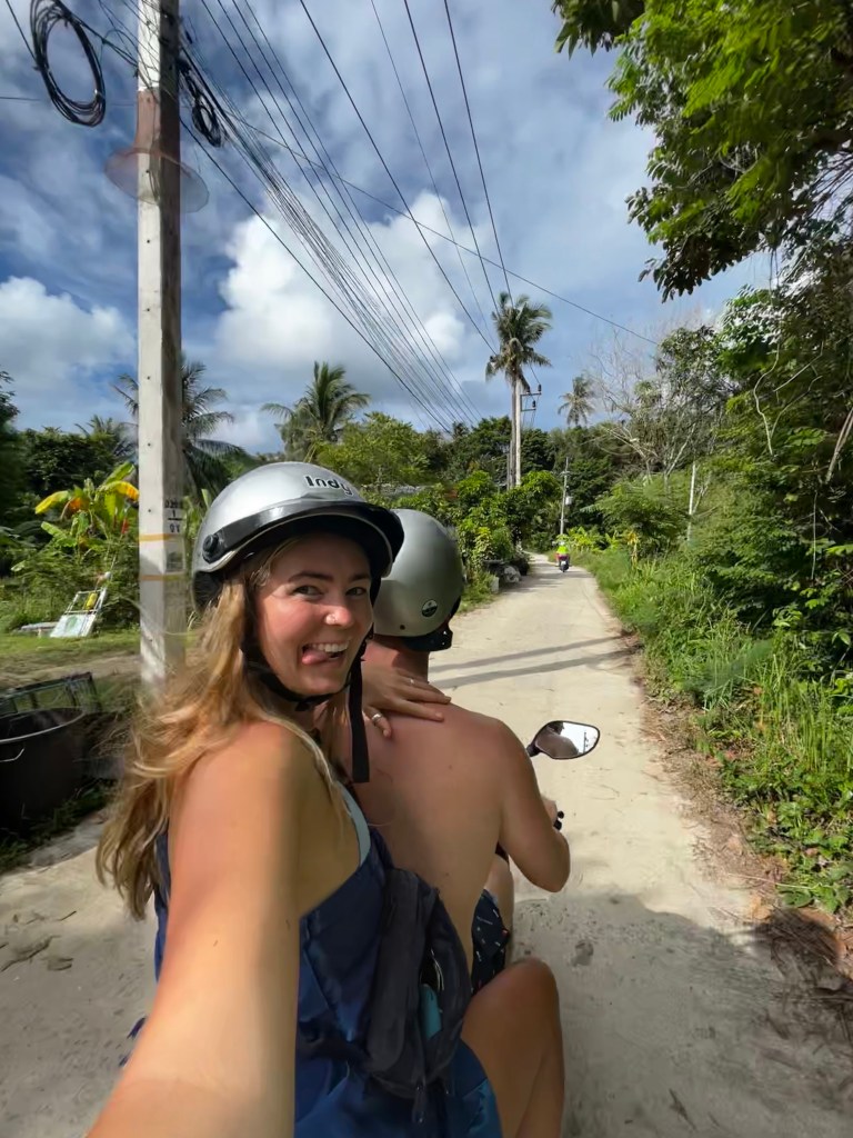 On our first day of exploring, I sat behind Dara on our bike as we sped through every climate and season in the space of 30 minutes, taking us to the northern coast. Torrential rain was interrupted by blue skies and again replaced by wind and rain, confusing my poncho which was being constantly taken on and off. However, the ride was amazing. With the jungle surrounding us, we rode up and down the hilly northern side of the island as the coastal views spoiled us. Bottle beach, which Ralph had been recommended to visit, was tucked away down a steep sand path, not suitable for bikes (but left a sweaty walk back!). Meeting a fellow Irish man (ironic, I know), we swam and ate before following the coast to other surrounding beaches, catching the few rays of sun while we could. As the sun sank, we set back for our next mission- the full moon party on Had Rin beach.