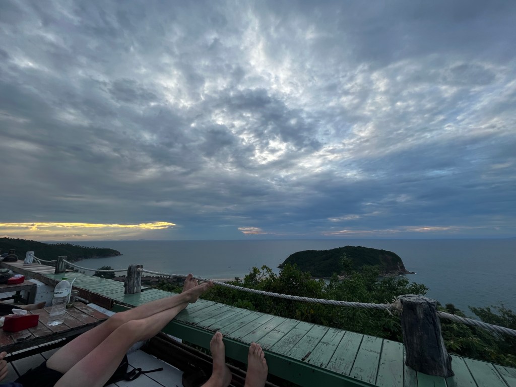 The following day we headed back up north, nursing slightly tired bodies but hungry for the scenes of the day prior. We were not disappointed, heading to Mae Haad beach the sun surprised us and soon enough the four of us looked very Irish… lobster like! After realizing our capacity for the sun was not the same as the others lounging on the beach, we headed up to 360* viewpoint cafe (also known as 420 cafe, people certainly visit for both!). I have to say, this was one of the coolest spots I’ve seen in my time here, and as we chilled out in beanbags overlooking the islands and horizon, I felt content, and still feel the same thinking about the sun setting as we laughed and shared stories.