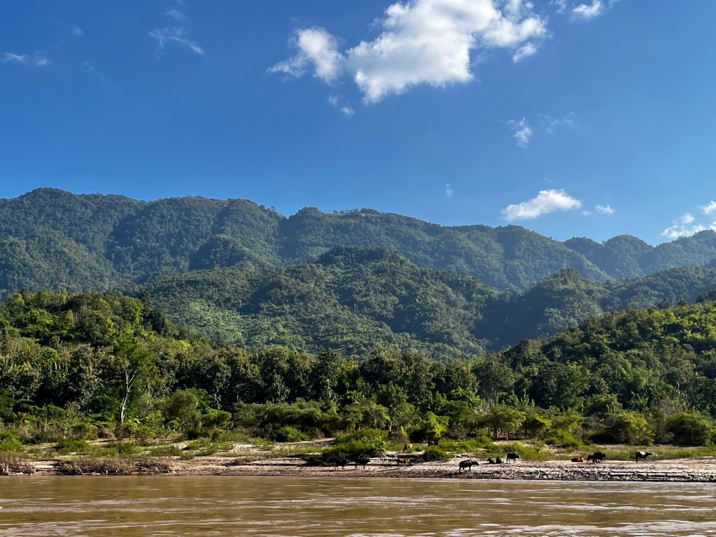 The journey from Pak Beng to Luang Prabang started at 9am the next morning. As we walked down to the boat, the misty weight of clouds hugged the mountain tops. As we boarded once more and started down the river, the sun slowly burned through the mist, blue skies showing their faces once more. Less tired than the day before, I was completely at ease for the entire day. Lazily reading my book, playing cards, and laughing with friends, it could have been one of my favorite days thus far. The views matched that of our first day, cows grazing lazily on the river bank as children giddily played in the water, showing off their backflips as we passed. Pure innocence, pure childhood. We stopped off along the way, collecting and dropping off people and supplies. Some young Lao girls lined the boat beside ours, selling bracelets for donations. The real sale was their smiles. Though I would say it reminded me of lemonade and cookies stands run by keen young entrepreneurs on the roads of rural Ireland, I think the financial necessity for these girls was different. Life on the Mekong is not easy, and they served as a reminder of that. No roads around, the residents of the huts along the river use the Mekong as their source. Their source of transport, of water, their source of food and of fun, evidenced by the laughing children swimming in its murky waters. A simple way of life, but not an easy one.